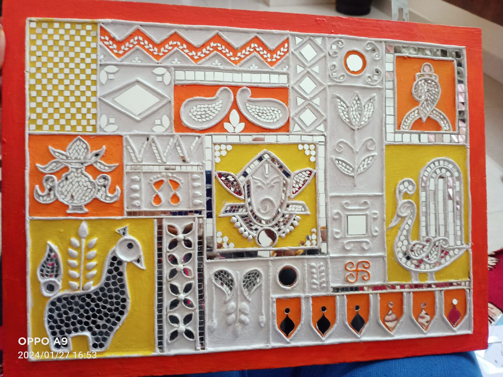 This Worli art painting beautifully illustrates the cycle of life through traditional tribal motifs. Stick figures gracefully depict various stages of life—birth, youth, adulthood, and old age—woven together in a rhythmic flow. With its simple yet profound imagery, the painting captures life’s continuity, symbolizing growth, work, family, and the inevitable return to nature.